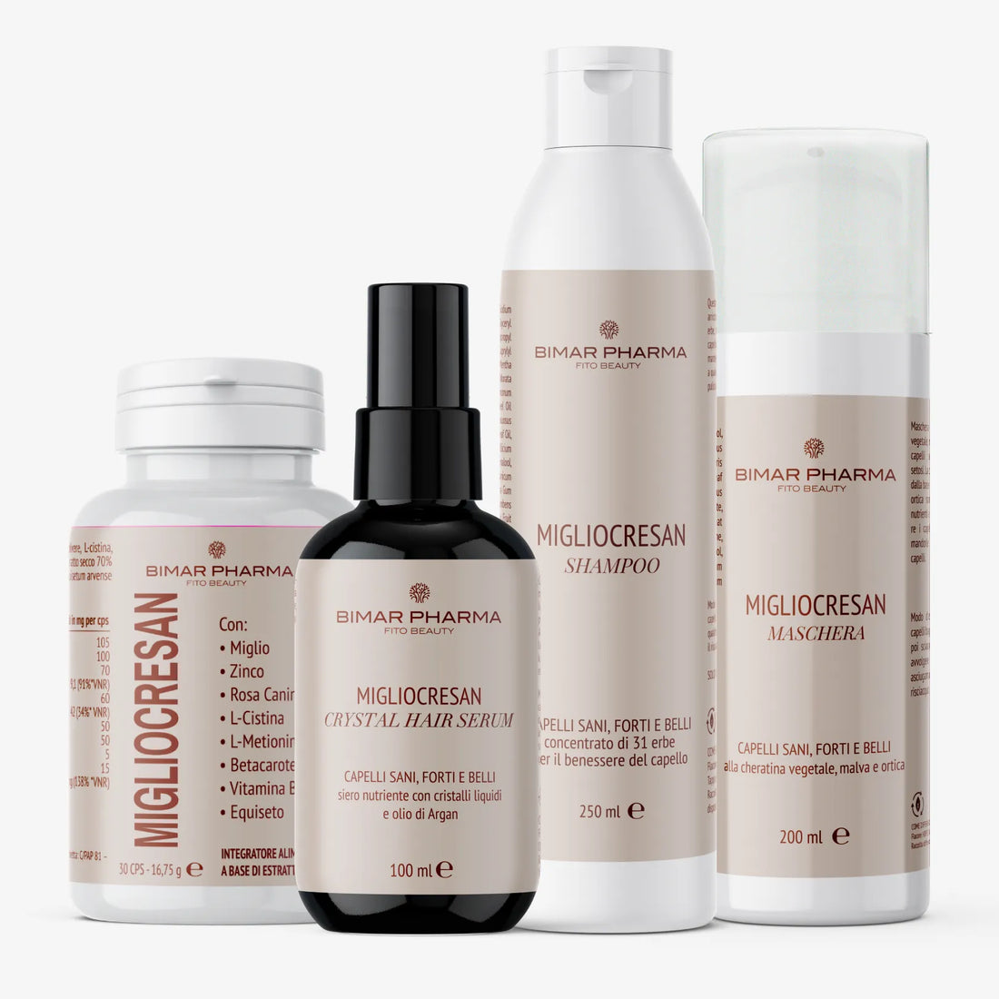 Programma interno-esterno anticaduta e rinforzante con Cheratina vegetale, Serenoa repens, Concentrato 31 erbe, Malva, Ortica, Miglio.